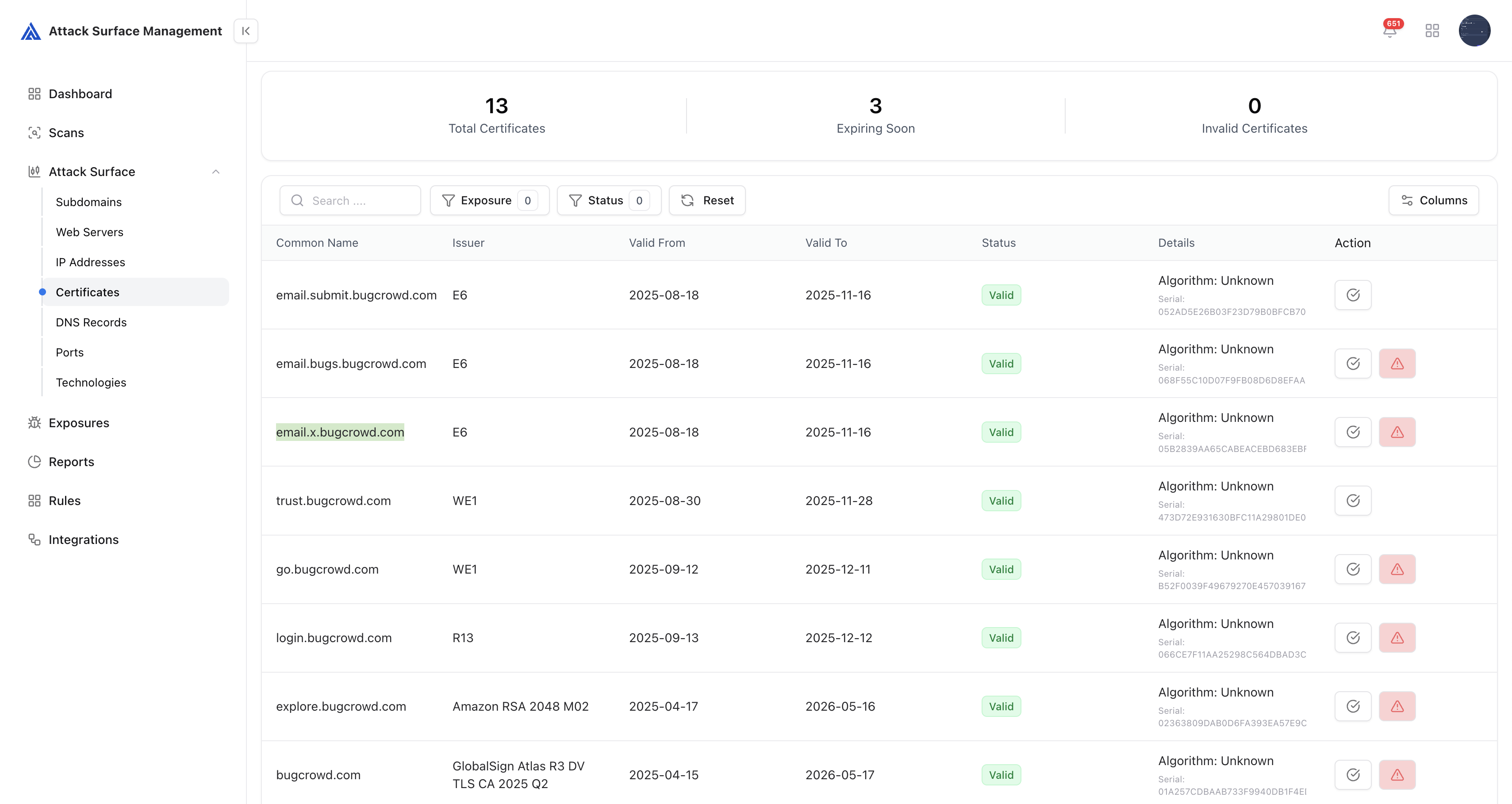 Correlate certificates across subdomains and IPs for a unified certificate inventory.