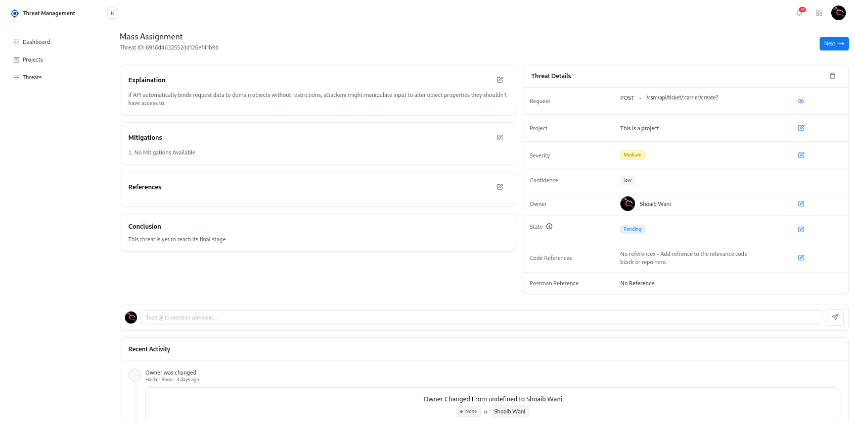 Threat Analysis provides deep, structured insight into every identified threat.Each threat contains full context — including explanations, severity, confidence, evidence, request metadata, mitigations, and activity history — enabling teams to investigate effectively and resolve issues with precision.