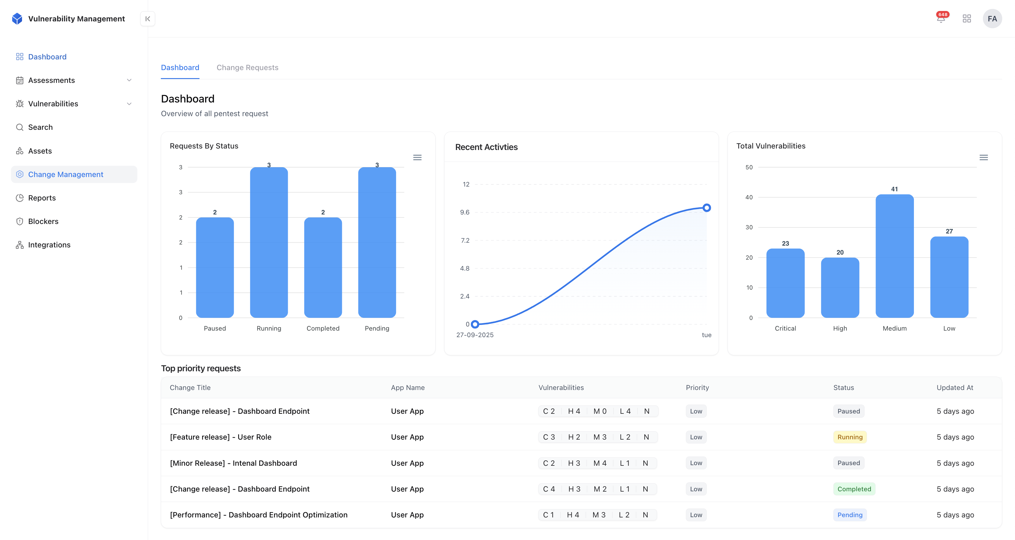 Visual dashboards highlight request trends, recent activities, and vulnerability distributions across critical, high, medium, and low severities.
