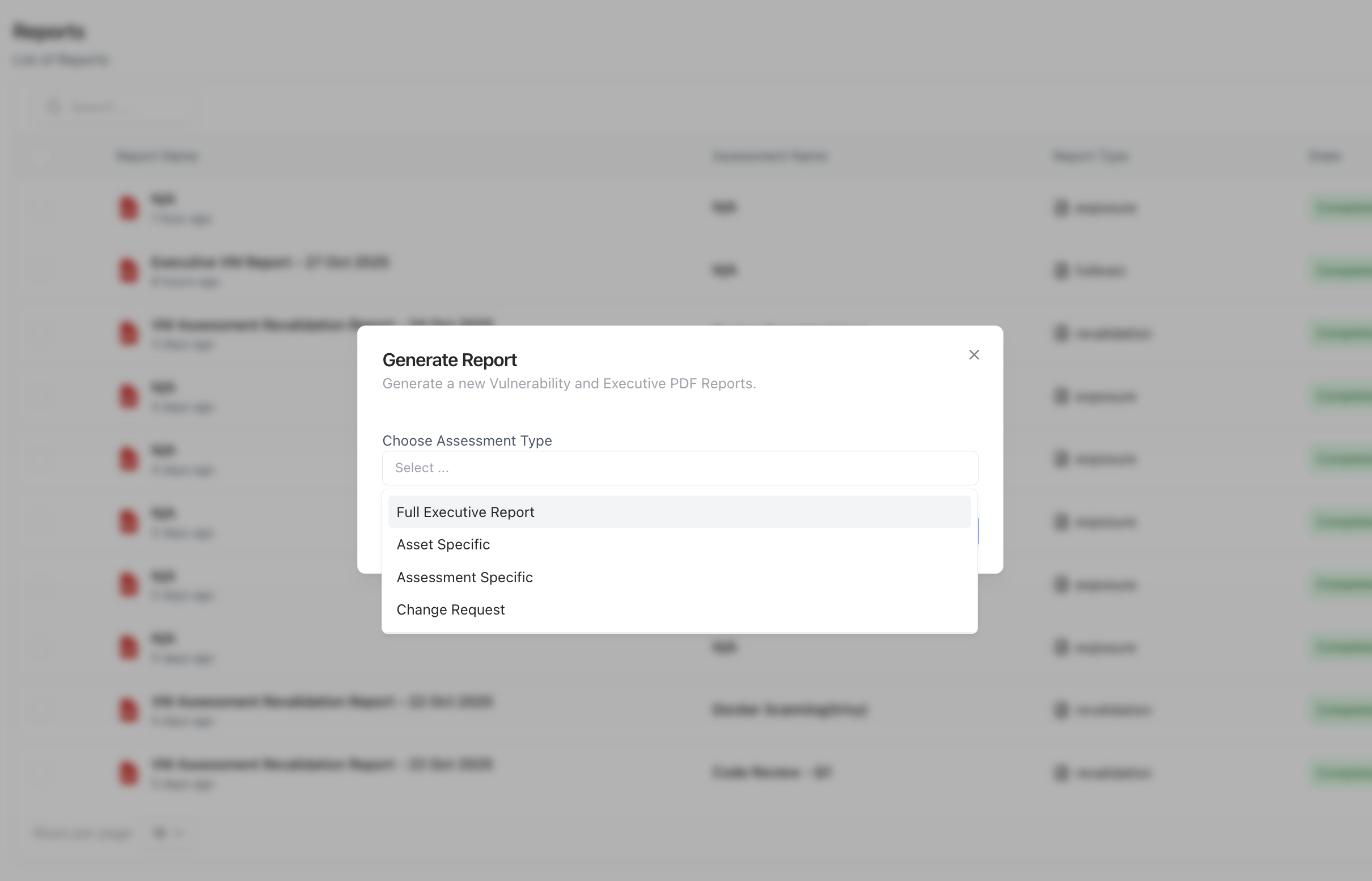 Design and export reports with flexible filters — by assessment, asset, severity, or remediation status.