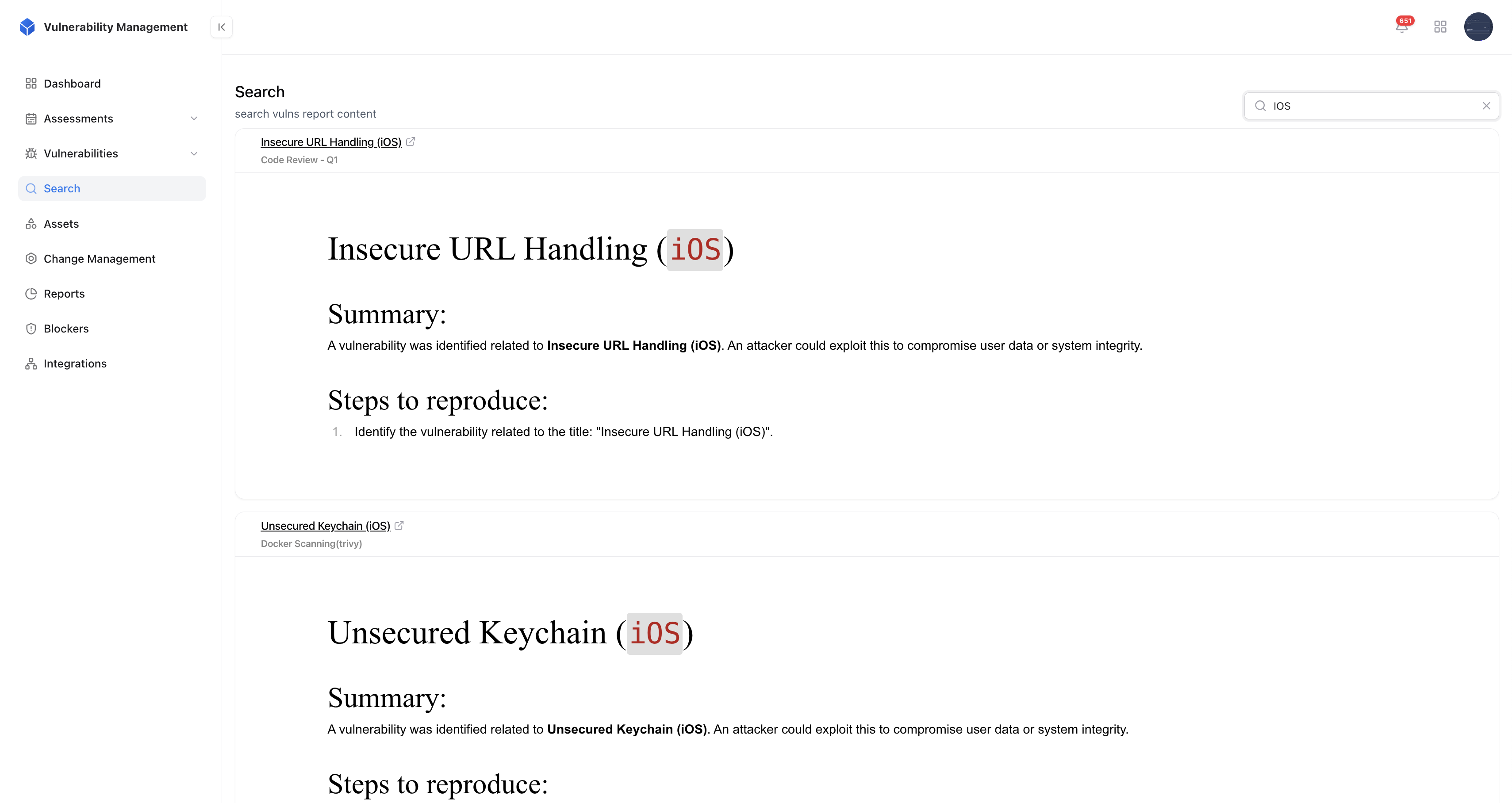 Search across vulnerabilities, assets, assessments, and tickets — all from a single interface.