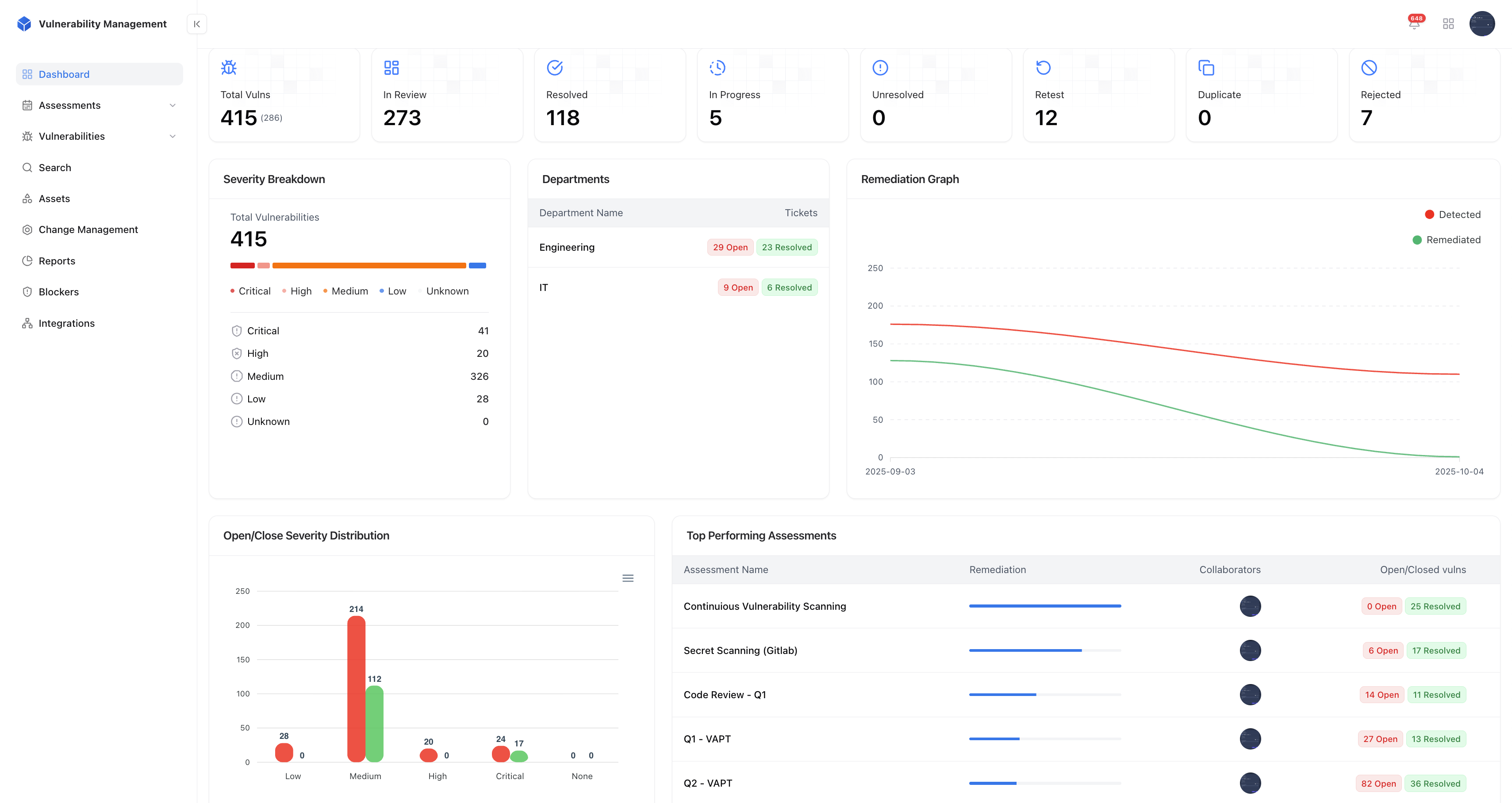 The Unified Vulnerability Dashboard brings together all vulnerabilities detected across assessments, assets, and teams into a single, actionable view.It helps security teams instantly understand their current risk posture and remediation progress.