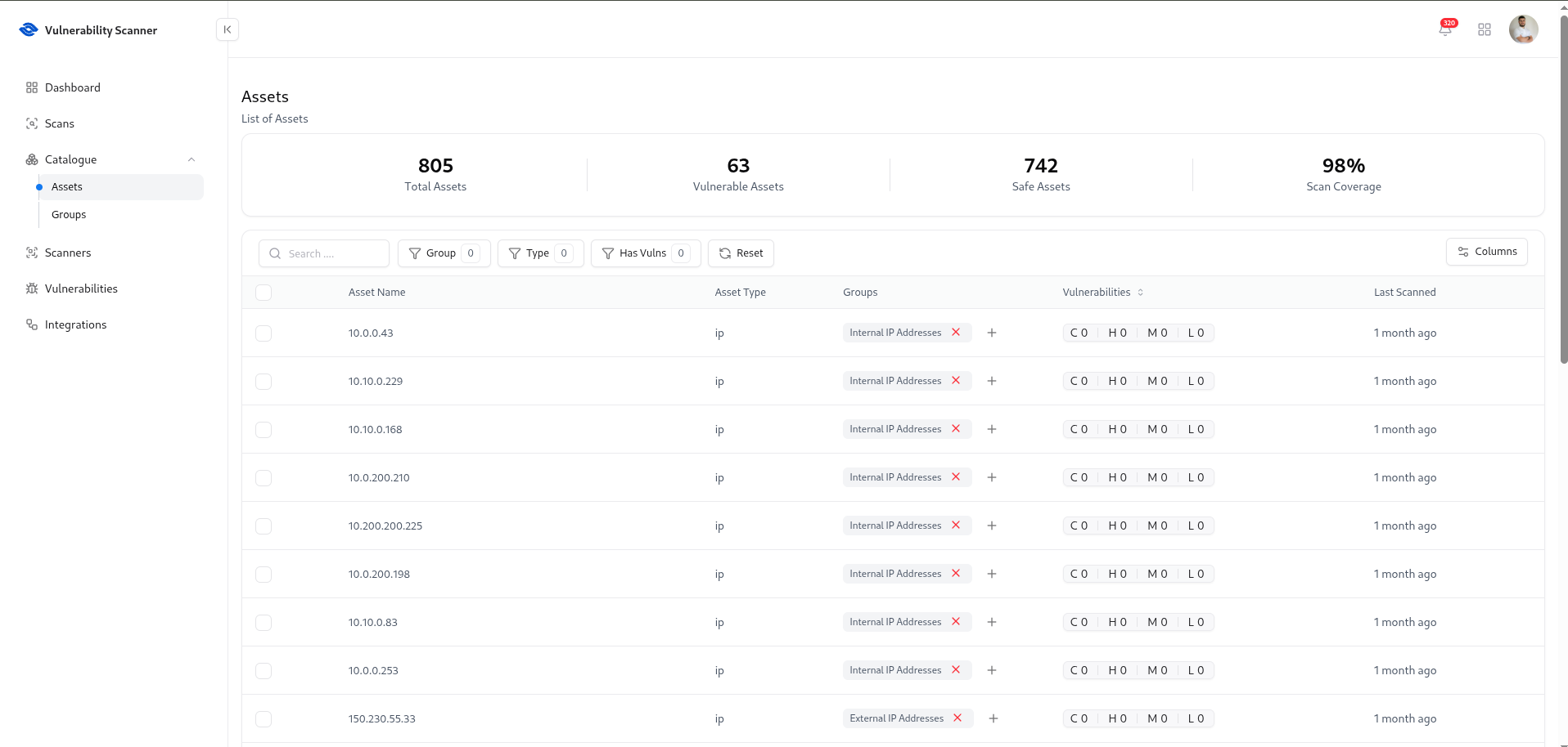 The Full Asset Catalog provides a unified, always-up-to-date inventory of every asset scanned by the Vulnerability Scanner.It consolidates hosts, services, applications, APIs, and cloud resources into a single source of truth — complete with visibility into health, scan coverage, and exposure levels across your environment.