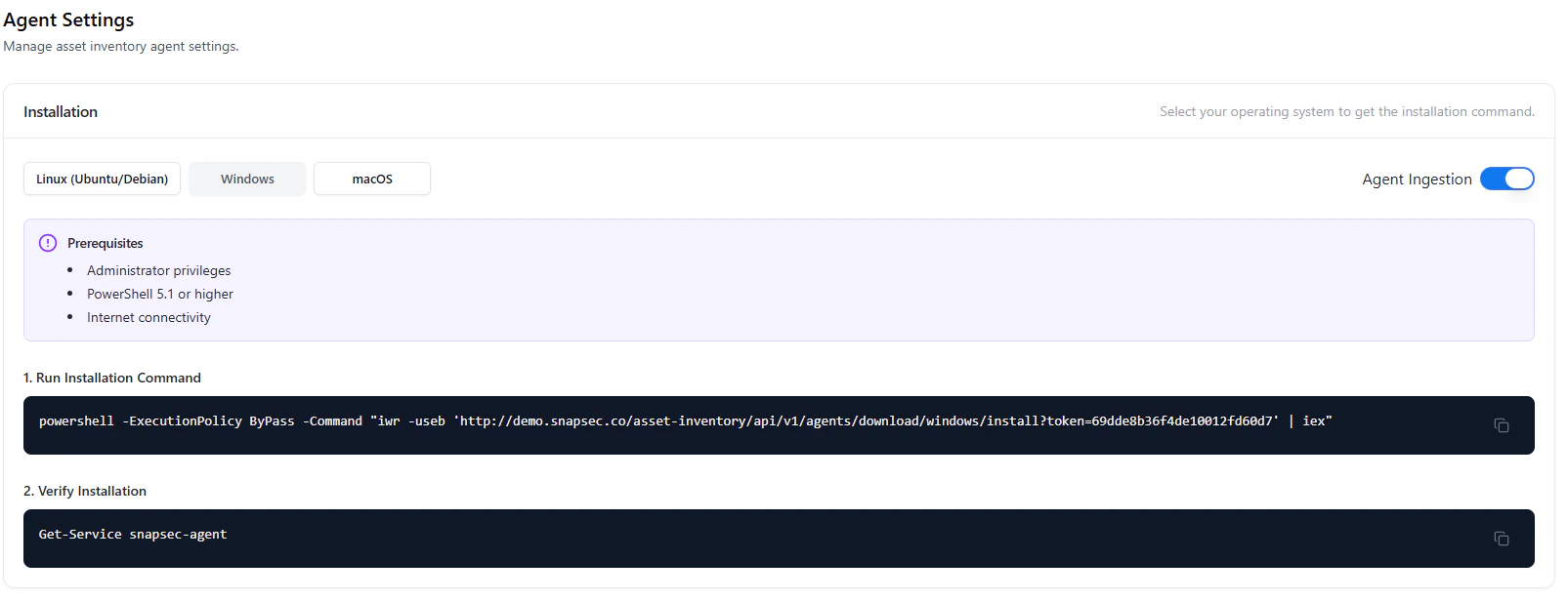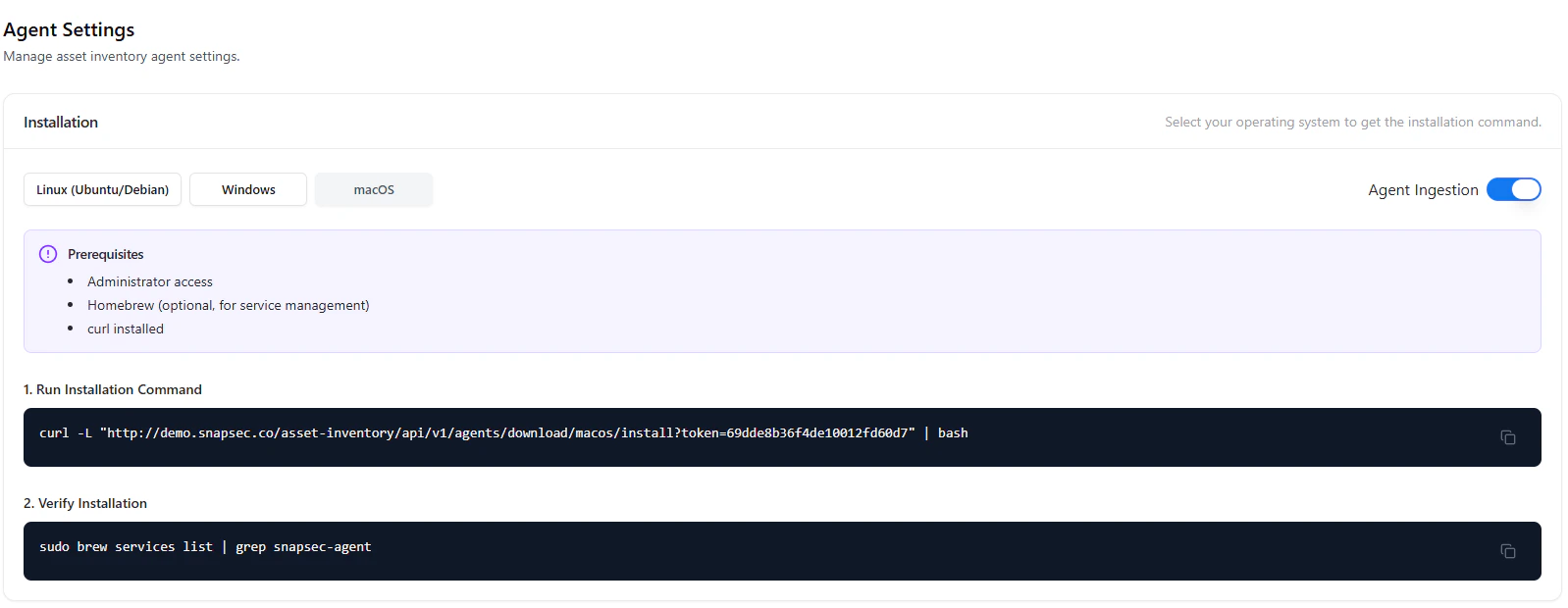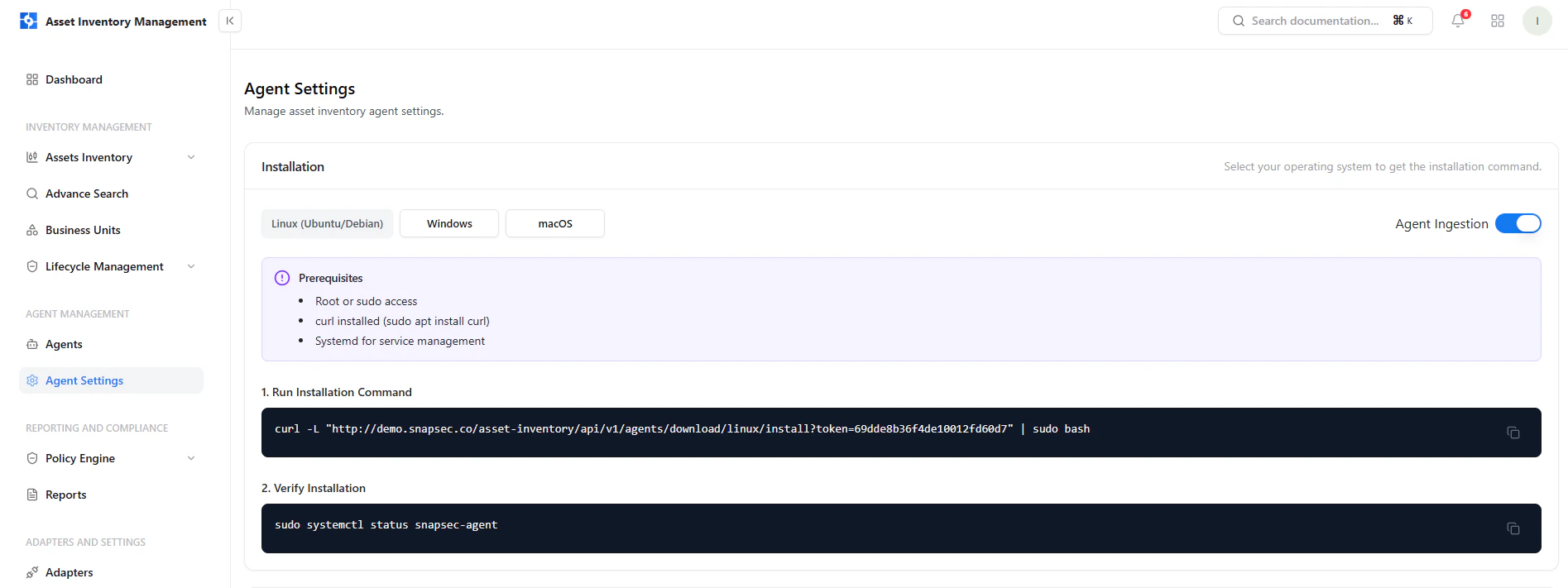 The Agent Settings module allows you to install, configure, and manage agents across multiple operating systems. Agents are responsible for collecting asset data and sending it to the platform in real time. This section provides installation commands, prerequisites, and operational controls for managing agents efficiently.Installation (Linux)