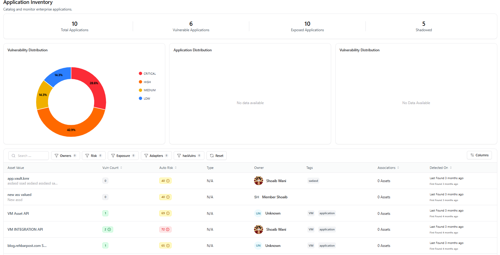 The Application Inventory dashboard provides a centralized view of all applications discovered across your organization, including internal apps, APIs, and externally exposed services. It helps teams understand application exposure, vulnerability concentration, and ownership at a glance.
