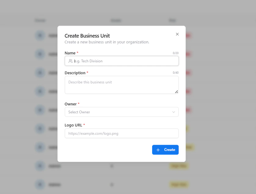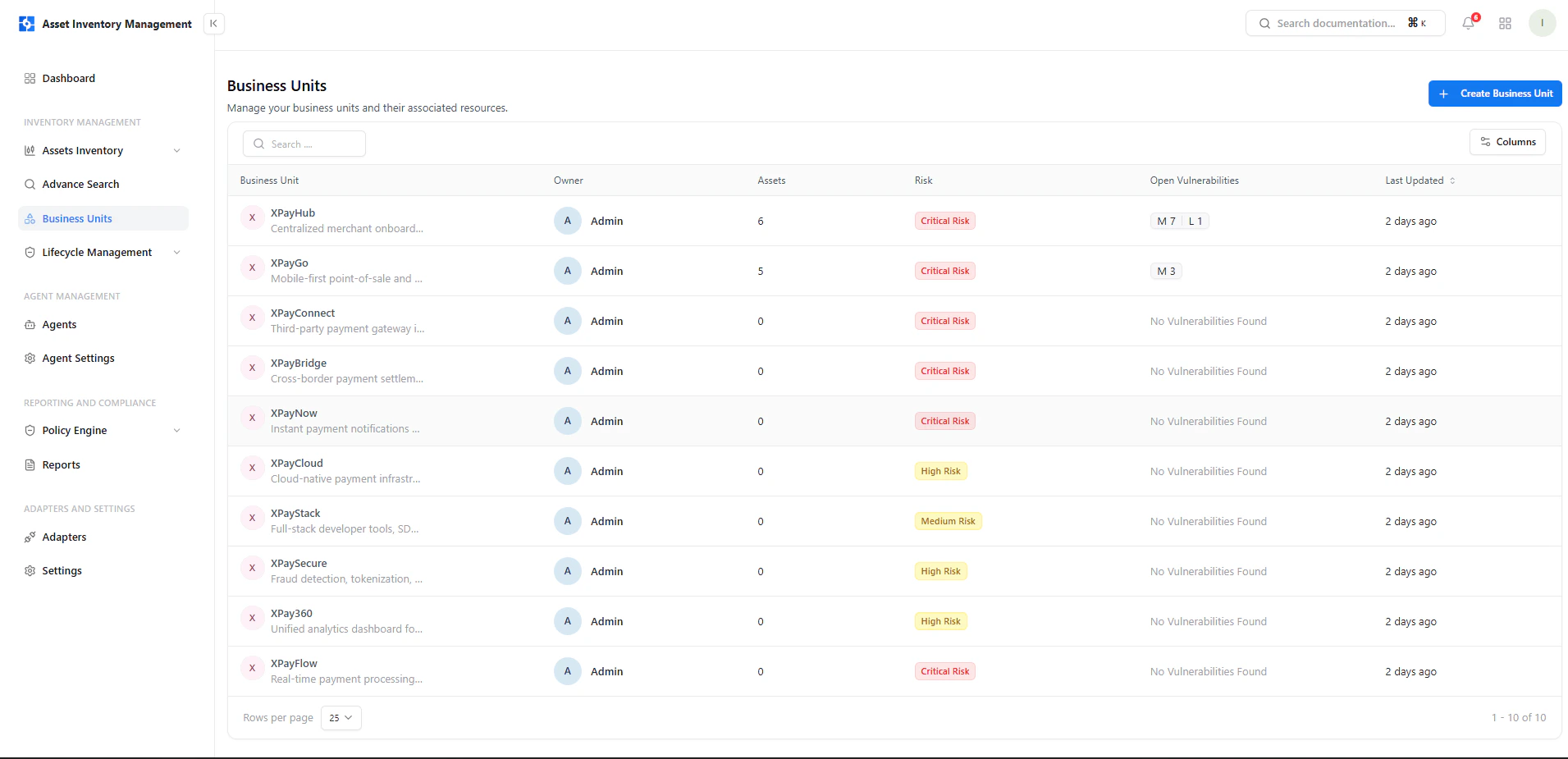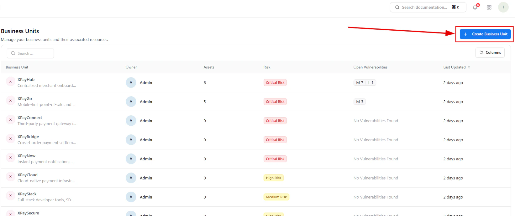 Business Units provide a logical grouping of assets based on organizational structure, product lines, or operational domains.This allows security and engineering teams to understand who owns what, where risk exists, and how vulnerabilities impact the business. Each business unit aggregates assets, vulnerabilities, and risk signals into a single, actionable view.