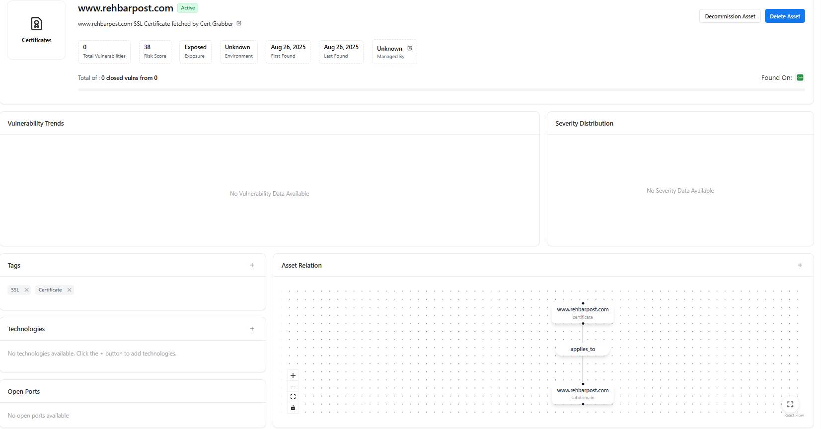 The Asset Relation Graph visualizes how the certificate connects to other assets such as:- Domains