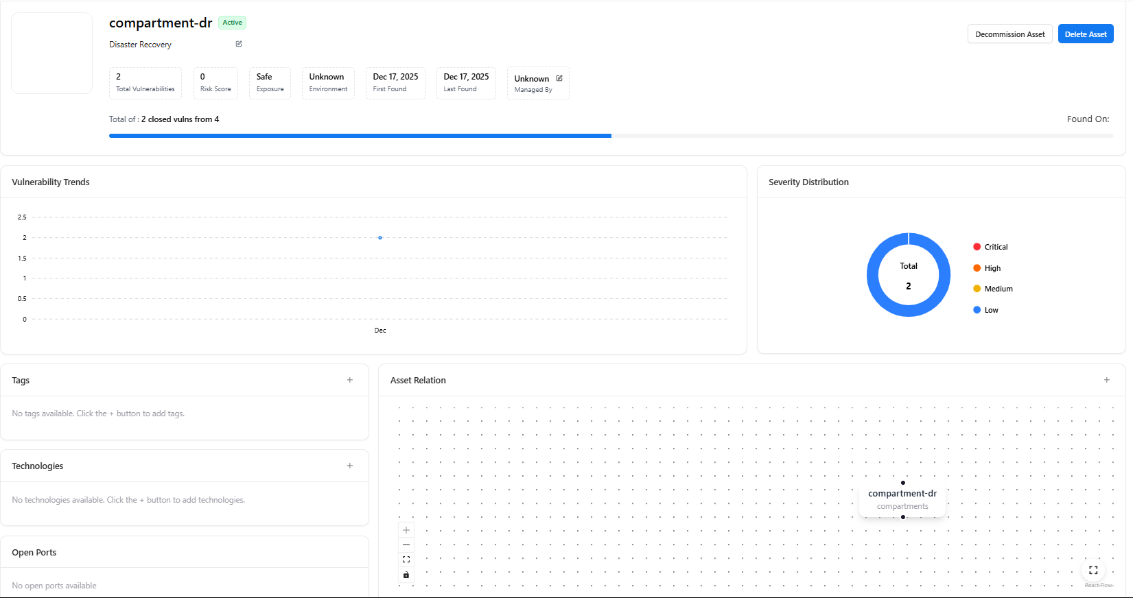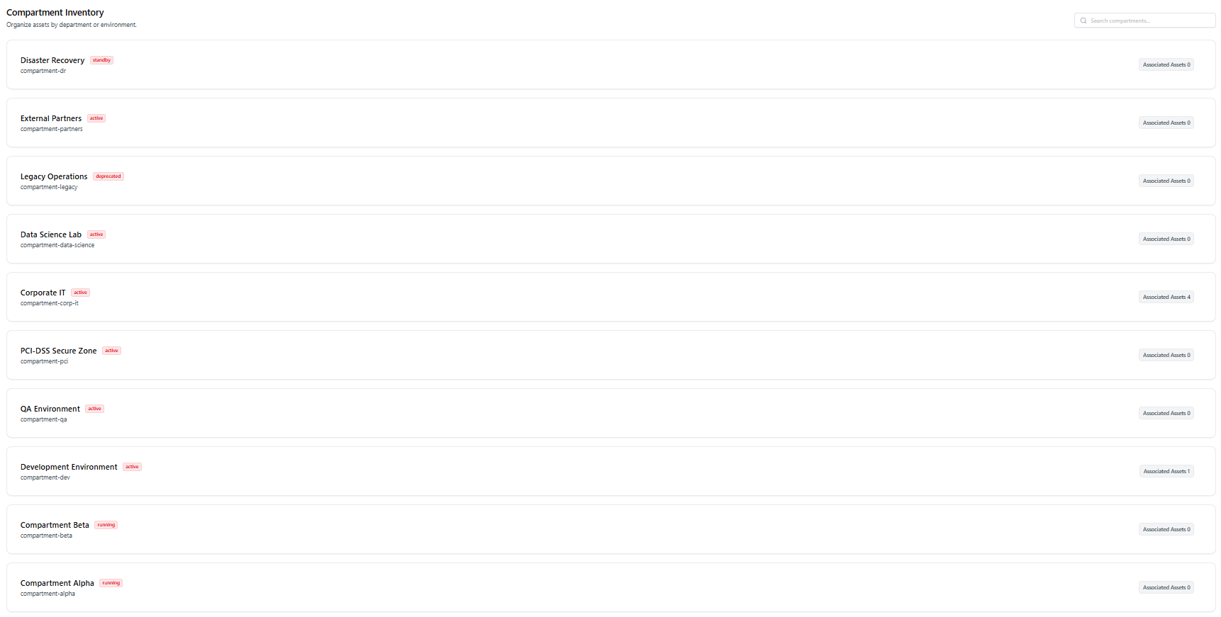 The Compartment Inventory provides a structured view of all OCI (Oracle Cloud Infrastructure) compartments within your organization.It helps teams clearly differentiate production, staging, development, and platform-specific environments — ensuring accurate access control, asset association, and lifecycle oversight.
