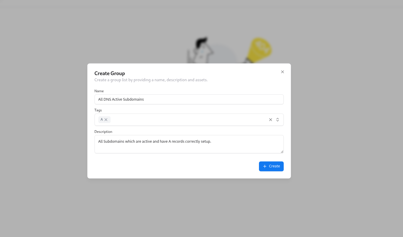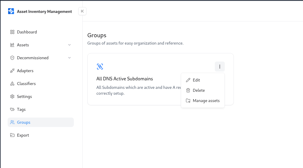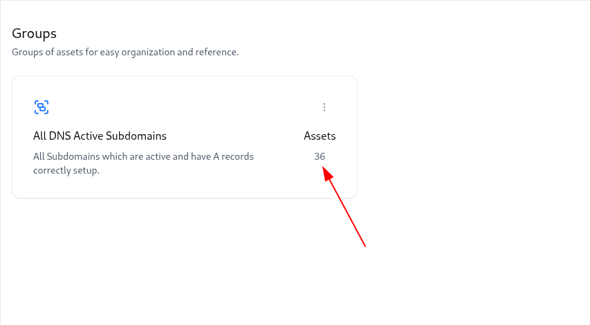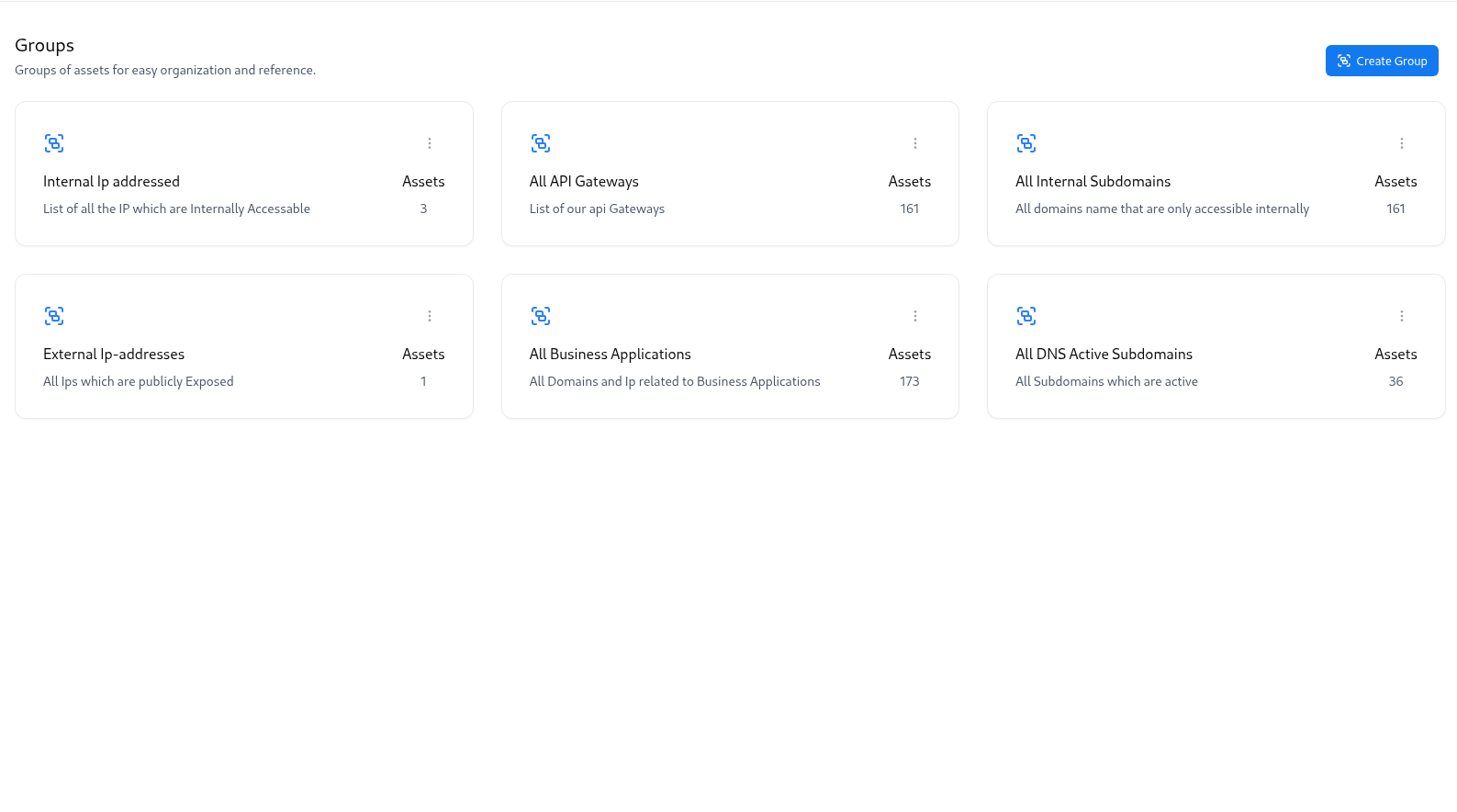 Groups in Asset Intelligence Management (AIM) allow you to cluster similar assets together — such as DNS-active subdomains, Cloudflare-reported assets, or API endpoints.This enables teams to manage related resources collectively, monitor them for changes, and apply consistent analysis or reporting. Groups can be static (manually created) or dynamic (auto-populated based on tags and rules).
