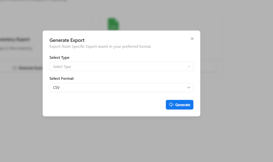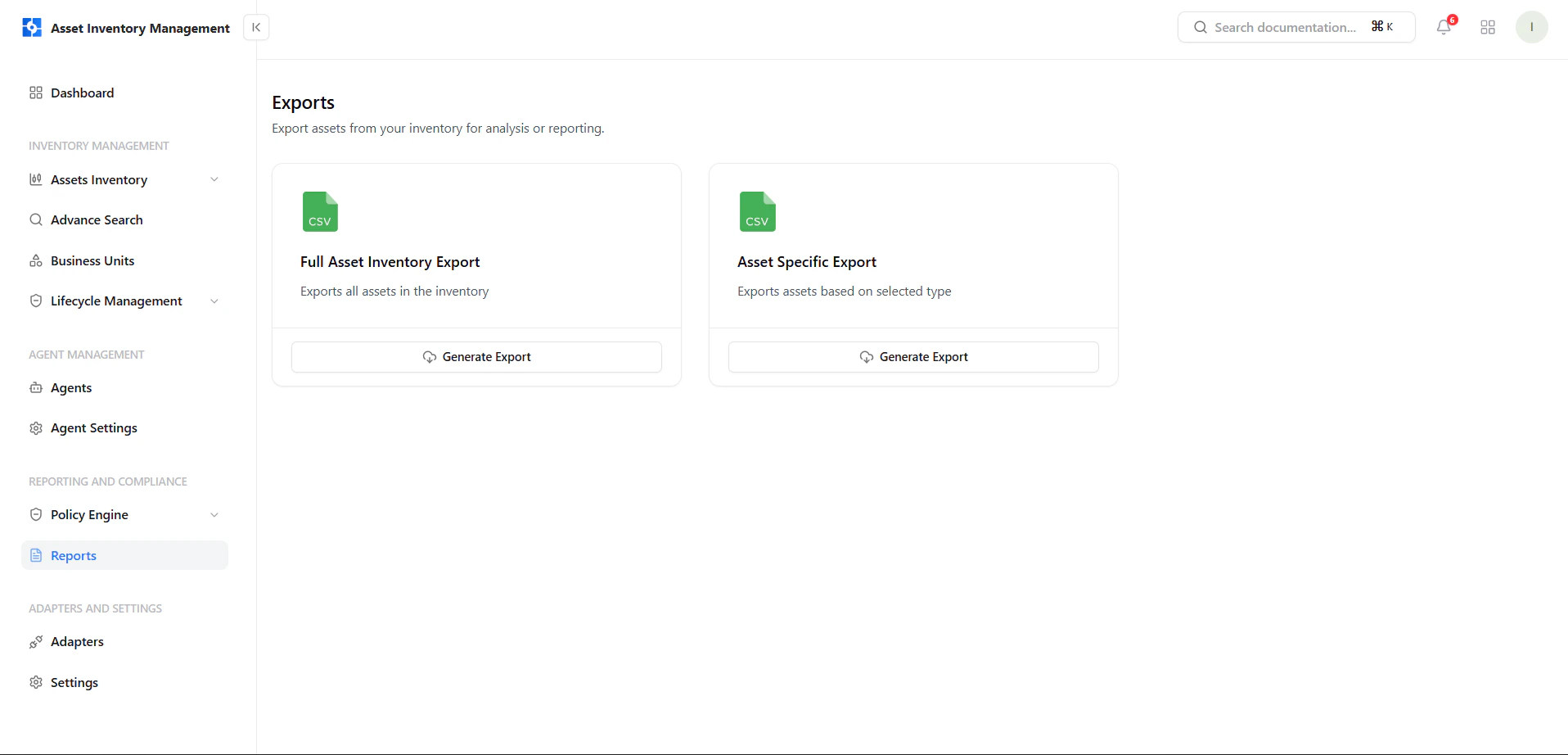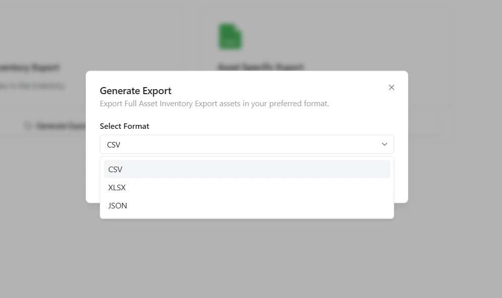 Exports allow you to extract asset inventory data for reporting, compliance, or external analysis. You can generate full inventory exports or filter exports based on specific asset types, and download them in multiple formats such as CSV, XLSX, or JSON.Export Options