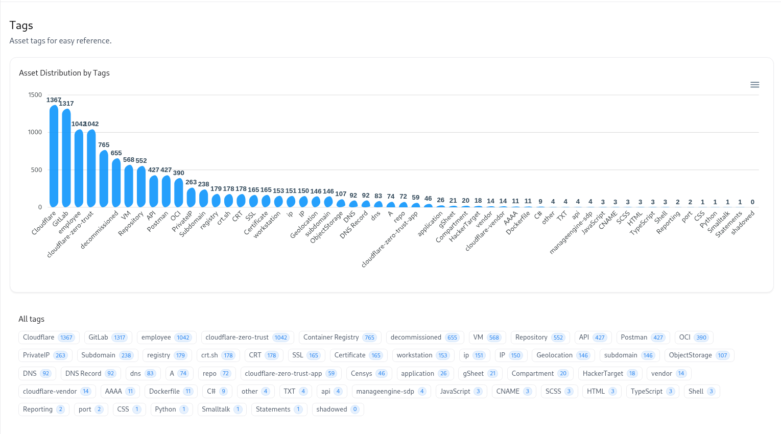 Visualize how assets are spread across tags like Cloudflare, GitLab, or Container Registry.