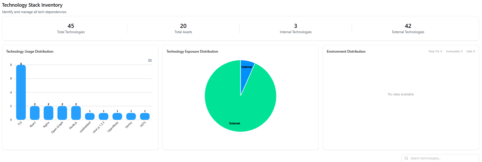 The Technology Index dashboard provides a high-level view of all technologies detected across your environment.It helps teams understand technology sprawl, external exposure, and dependency concentration at a glance.