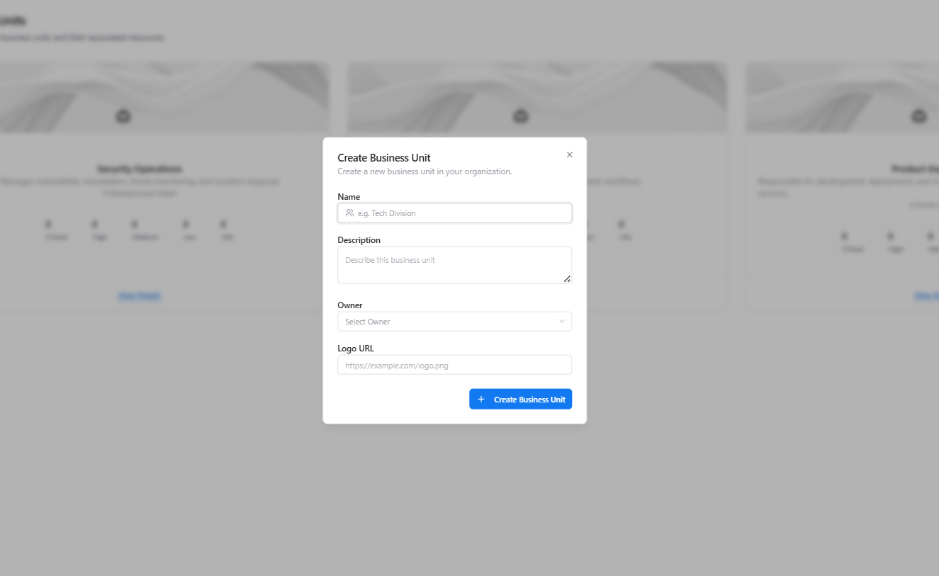 The Business Units dashboard provides a high-level view of how vulnerabilities and assessments are distributed across organizational teams. Each card represents a business function or team, enabling clear ownership, accountability, and risk visibility.