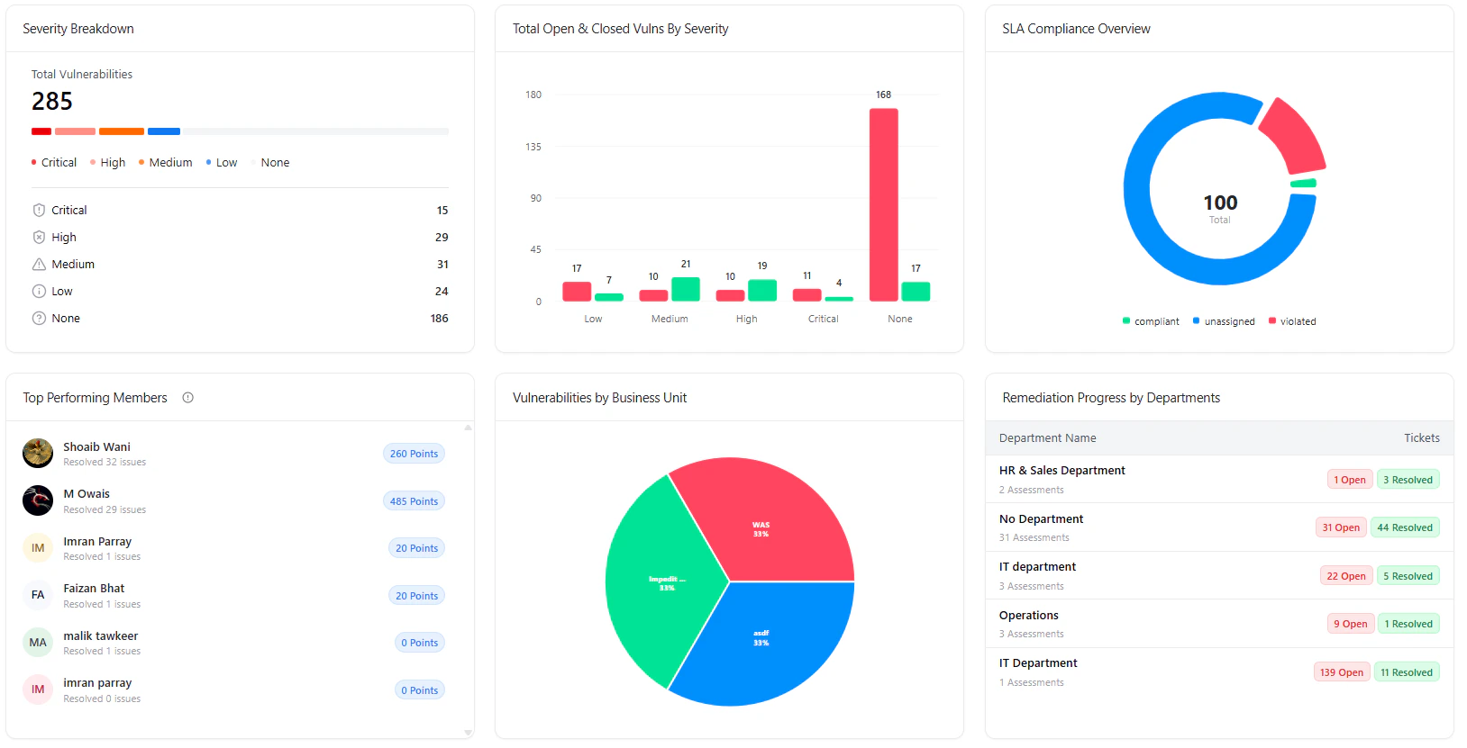 - Track how each department is performing in resolving assigned vulnerabilities.