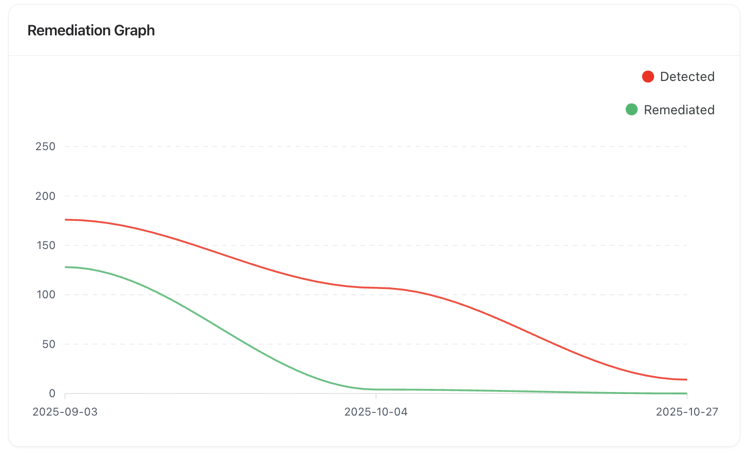 Visualize your remediation journey with trend lines showing Detected vs. Remediated vulnerabilities over time.