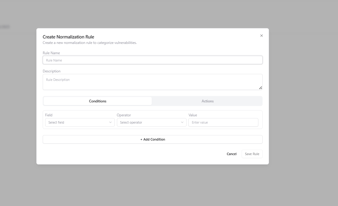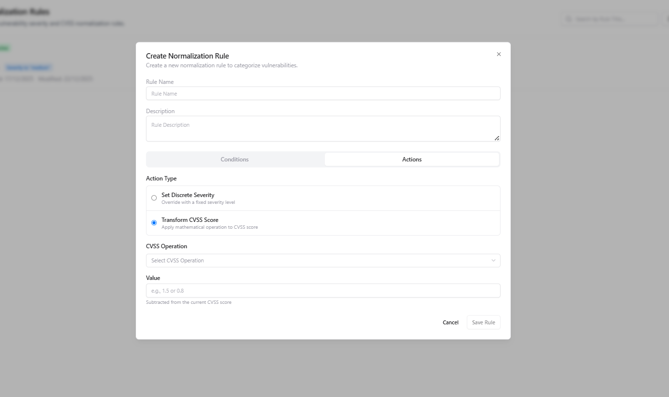 The Normalization Engine provides a centralized control layer for standardizing vulnerability severity and CVSS scores across all scanners, assessments, and integrations. It allows security teams to override scanner inconsistencies, reduce noise, and align vulnerability risk with internal security policies — ensuring consistent prioritization across the organization.