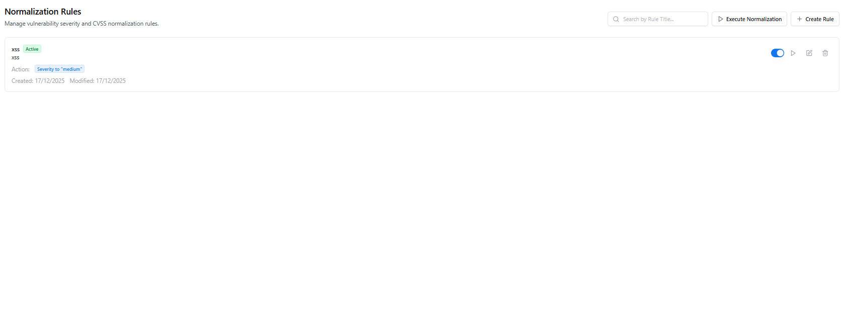 The Execute Normalization action applies all active normalization rules to existing vulnerability data across the platform. This is especially useful when:- New normalization rules are introduced