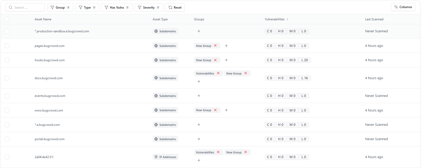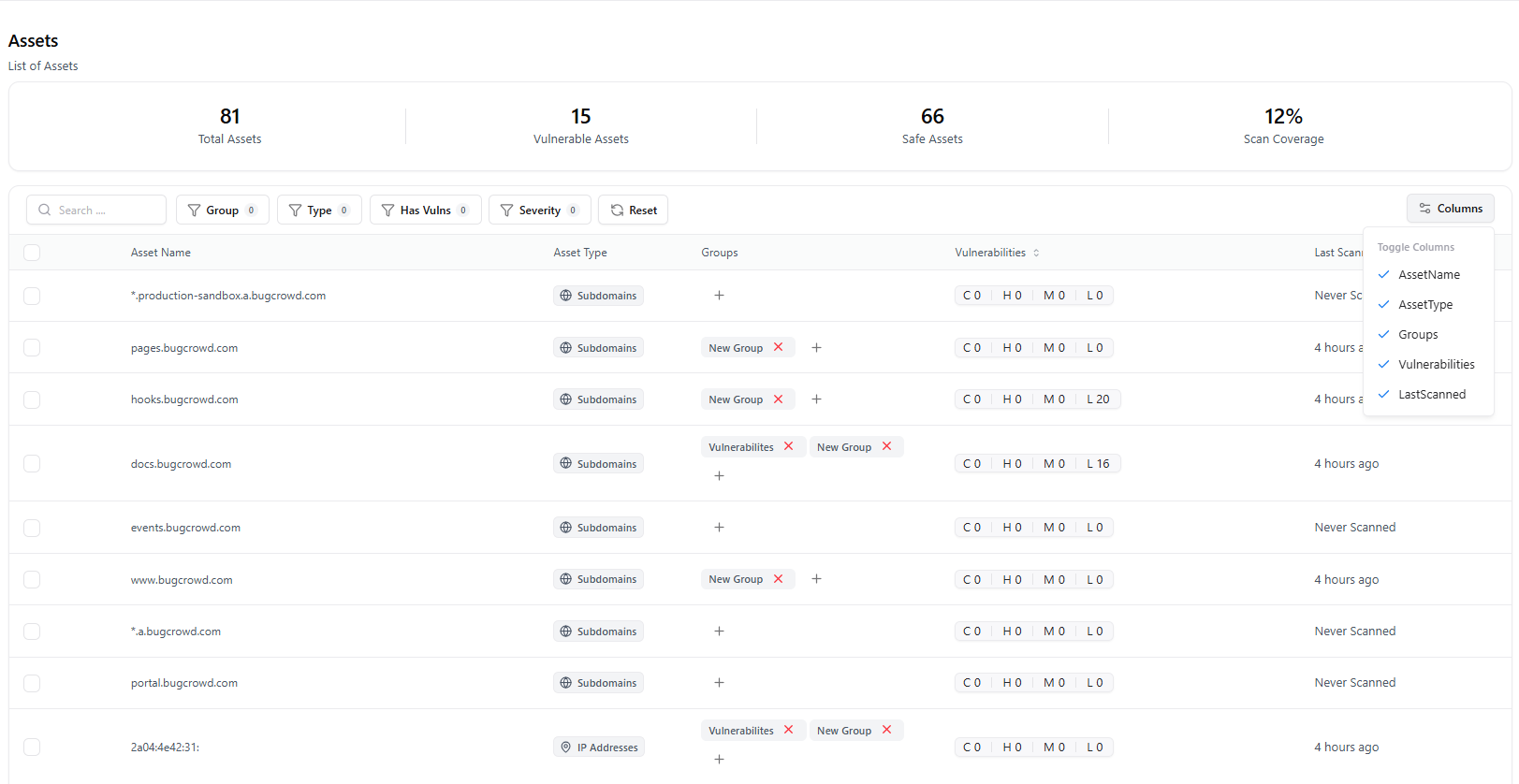 The Asset Catalogue provides a unified list of all assets monitored by the Vulnerability Scanner.It shows their exposure, vulnerability counts, scanning status, and risk posture — helping teams prioritize what matters most.