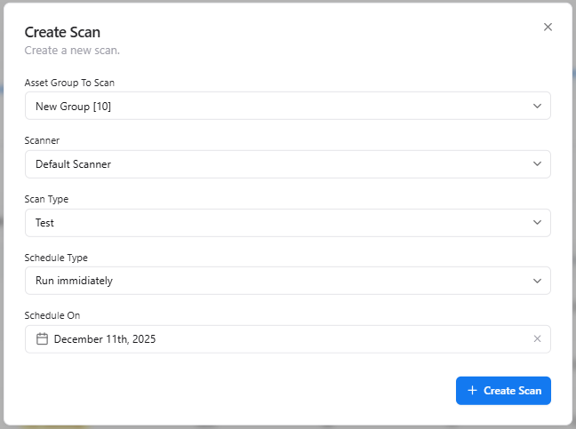 Define scan name, asset scope, scanner engine, and configuration settings to launch a new test instantly.