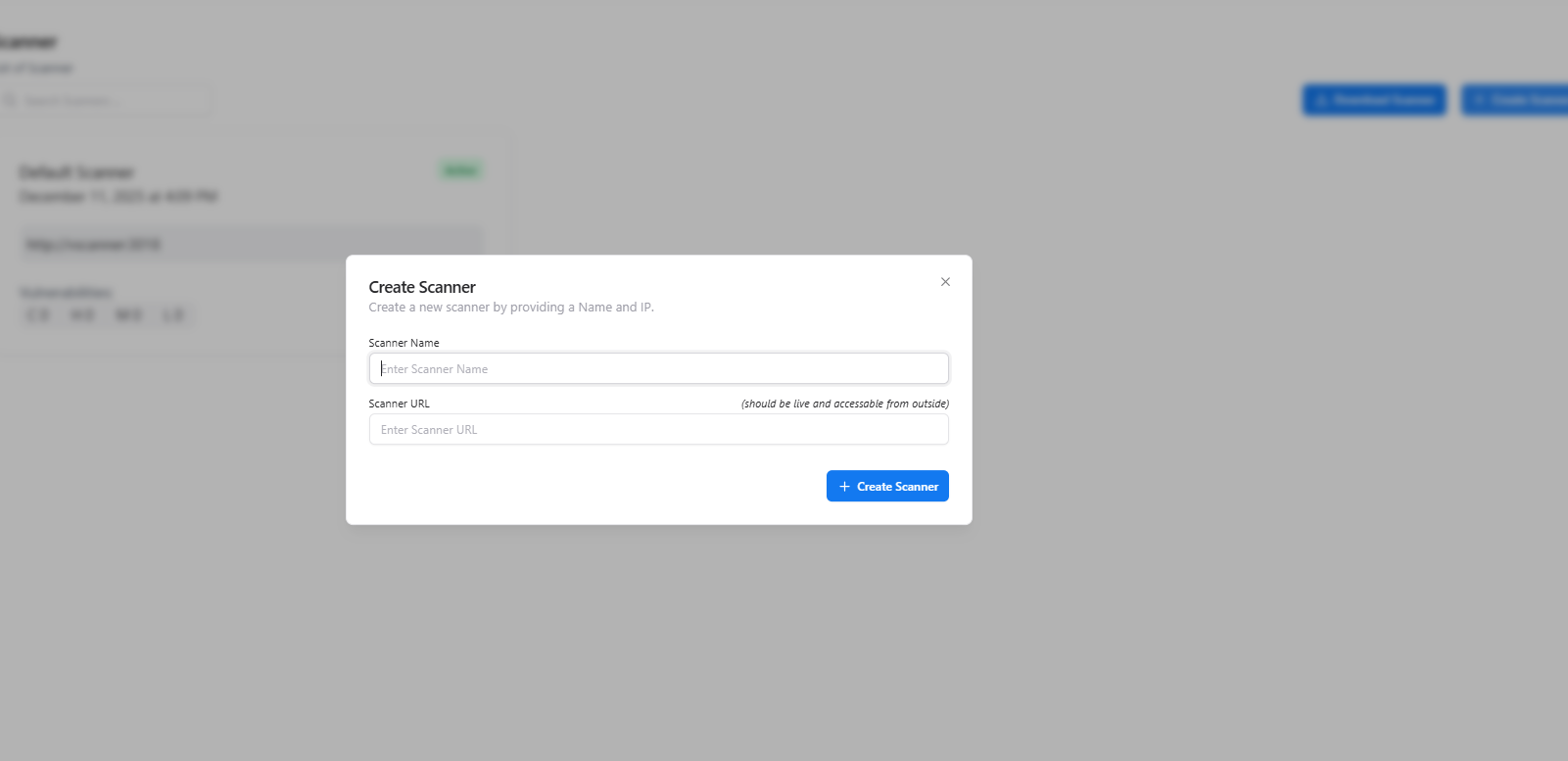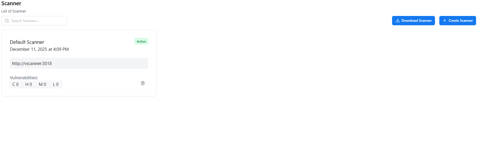 The Scanners page lists all registered vulnerability scanners and allows you to create new ones.Each scanner displays its current status, URL, and vulnerability counts discovered by that scanner.