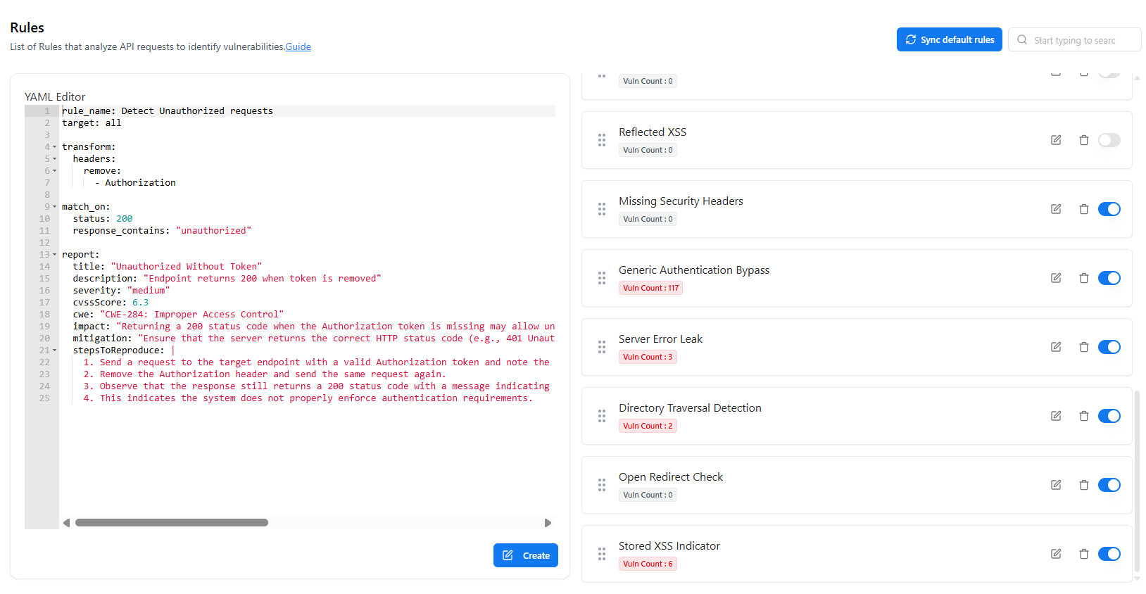 The Rules section defines how the Web Application Scanner (WAS) detects vulnerabilities.Rules analyze API requests and responses using configurable logic written in YAML, enabling precise and extensible security checks.