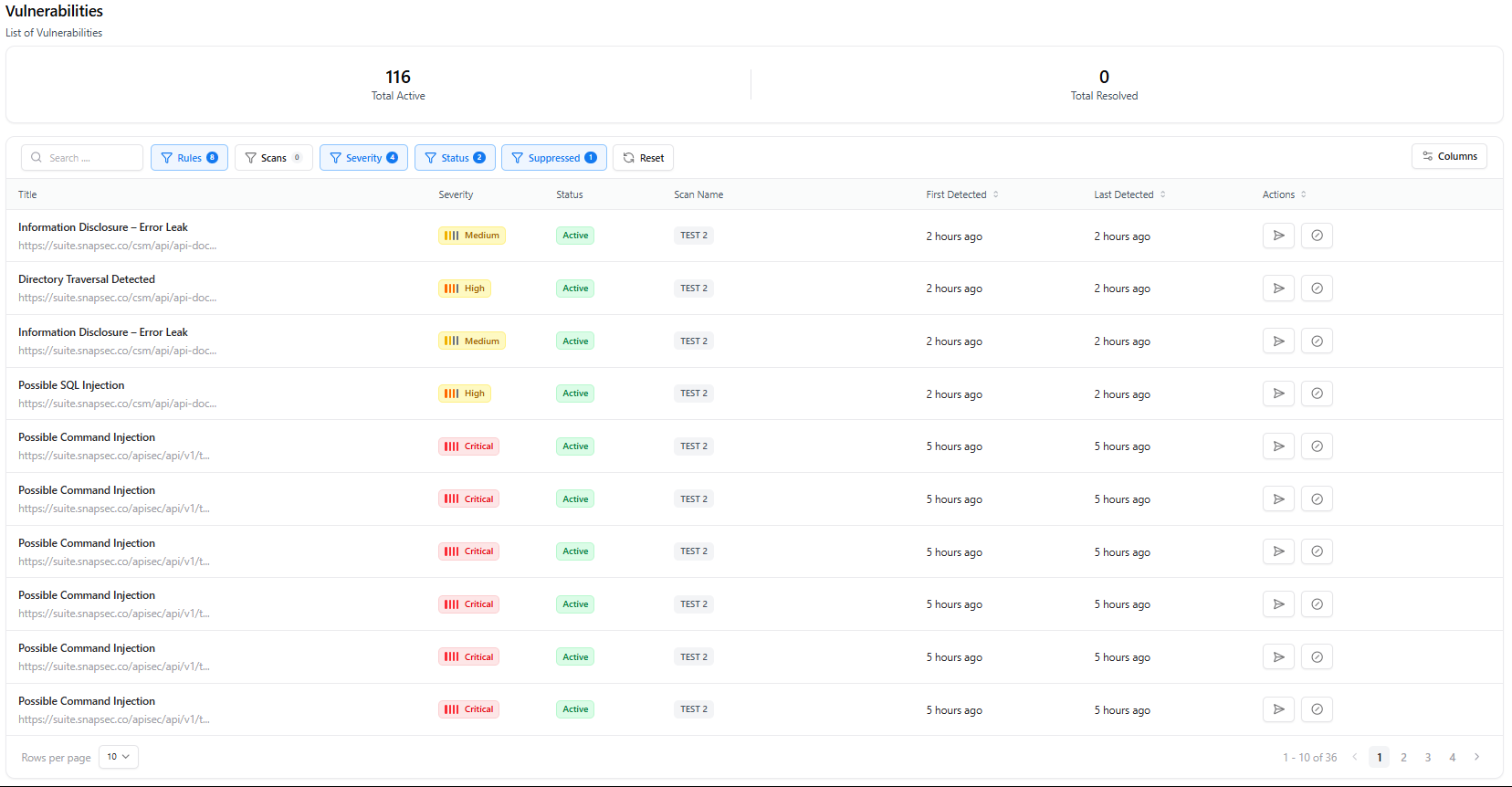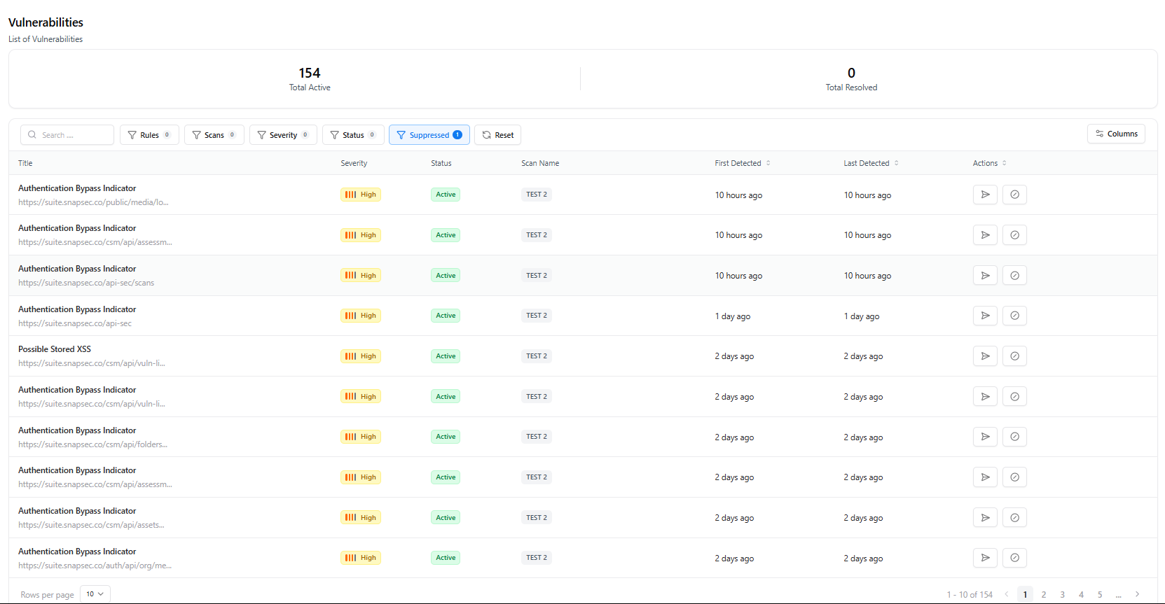 - Status — Active, suppressed, or resolved
